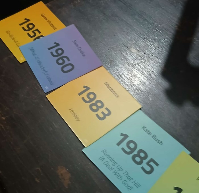 To start the game each player receives a card like the one’s shown below. Each card has a date in the middle of it and a song and artist on it as well. You get one to start your timeline.