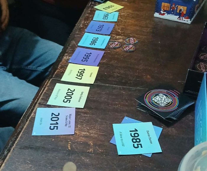 I played the role of the DJ. The DJ gets to play as well. The DJ will scan the current player’s card’s QR code with the app and it will call up Spotify and play 30 seconds of the song after you turn your phone over. The player whose turn it is has to identify where in their timeline the song belongs. So if your starting card says 1985 you have to determine if the current song is from BEFORE 1985 or AFTER.