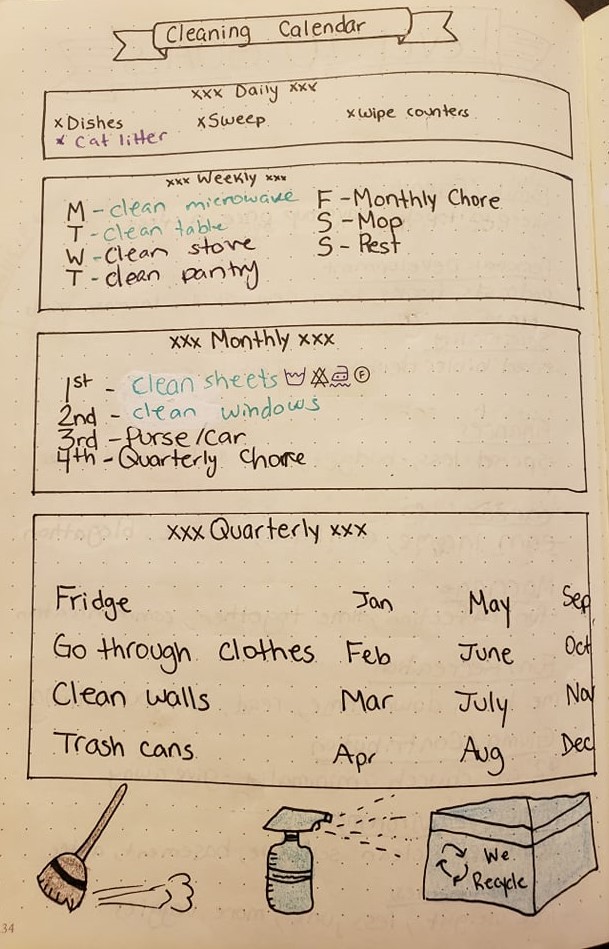 Here is my current routine. I have sections for daily chores, weekly chores, monthly chores and quarterly chores. Each Friday I do the monthly chore and each 4th Friday I do the quarterly chore. In my version, you don’t check off as you go because I use the same routine each week/month. However you can make yours however you want. A quick google search shows many different versions, many of which are more artistic than mine. Be as artistic or simple as you want.