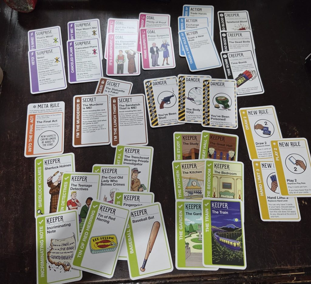 Below are just SOME of the fun cards in Mystery Fluxx. As you can see this game includes SURPRISE, DANGER, CREEPER and META RULE cards. SURPRISE cards can be played even when it isn’t your turn, DANGERS can cause one or more players to be eliminated from the game (possibly temporarily,) CREEPERS which are like KEEPERS you do not want. They can sometimes stop you from winning if you have them. META RULES stay in play until game is over (whereas other NEW RULES change all throughout the game.