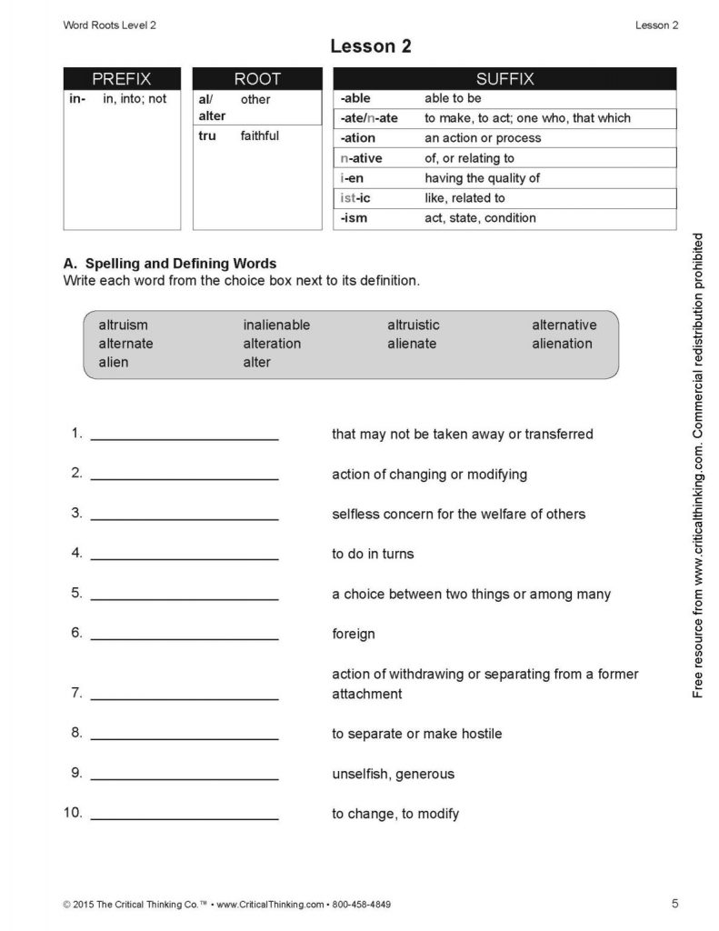 Below is a sample of one of the lessons. You are given prefixes, roots and suffixes to learn and then there is a worksheet to cement the learning in. You can work at whatever pace you decide. Typically one page a day 5 days a week works well.